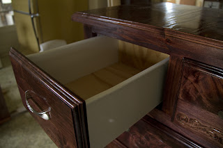 Then comes varnishing. I originally tried a clear satin on a dresser, but then I decided to try a little more shiny and went with a semi-gloss. The semi-gloss won. I like the shine, it gives it a little pizzazz. Varnishing takes awhile; coat, let it dry, sand, wipe, coat, let it dry, sand, wipe. You get the picture. I ended up only doing three coats, I've heard that some go up to like 10 or more...I liked 3.